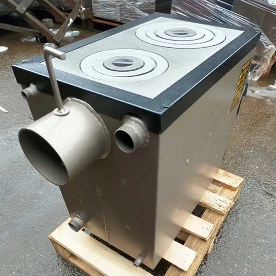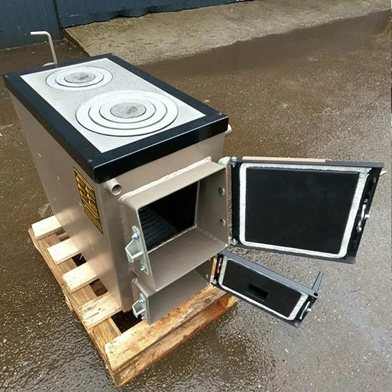 Котел + плита Bizon М-120П потужністю 12 квт призначений для опалення приміщень площею до 120 м², нагріву води та приготування їжі. Добре працює на будь-якому виді паливної сировини: (дрова, тріска, пелети, брикети, кам’яне вугілля). На одному завантаженні дров тривалість роботи досягає 6-8 годин. Конструкція гарного дизайну, облаштована плитою на дві конфорки, має ефективний теплообмінник.